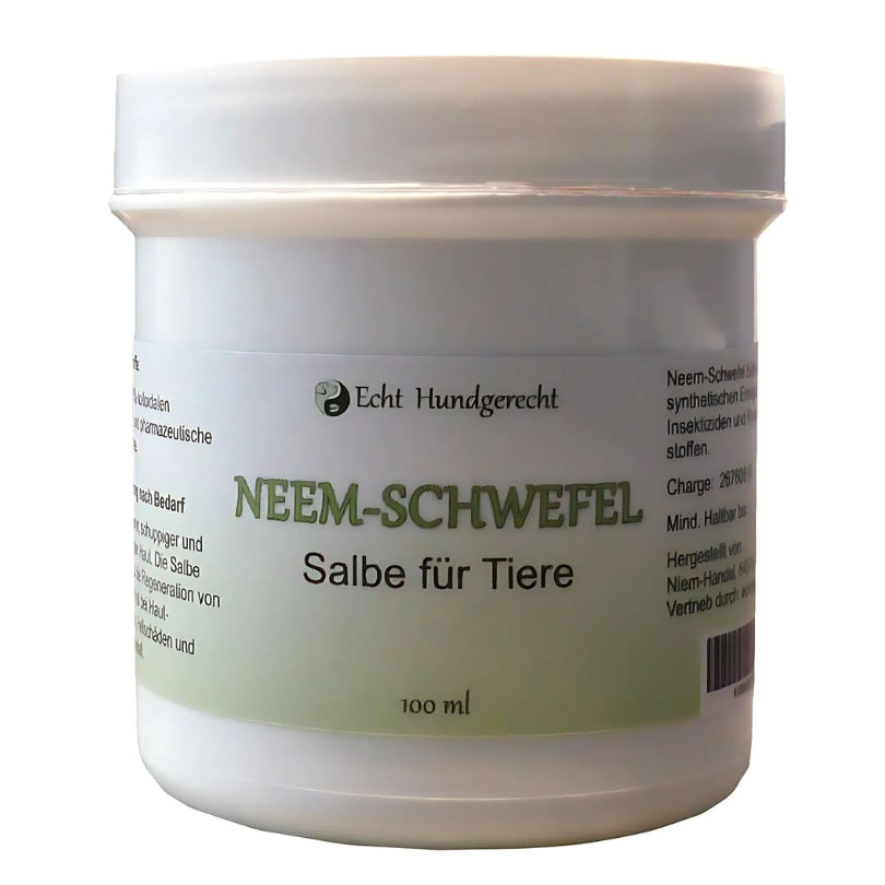 Beide Stoffe, Neem und Schwefel, haben eine antiseptische und entzündungshemmende Wirkung. Neem-Schwefel-Salbe eignet sich gut zur Weiterbehandlung nach einer ersten Versorgung des Hundes mit Neemöl.